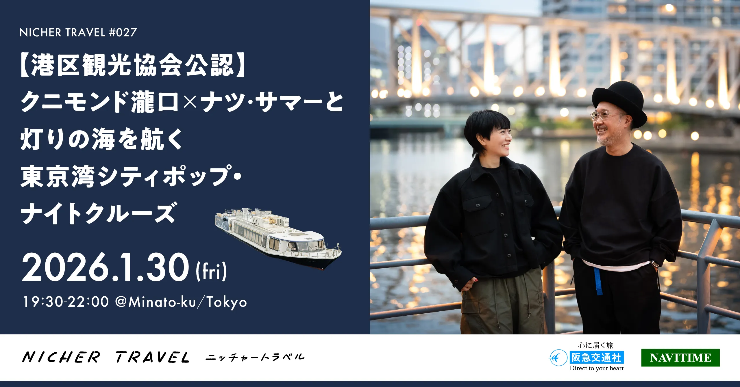 みなさん、こんにちは! 今回ご紹介するのは、クルーズ船「ジーフリート号」に乗り、シティポップを聴きながら冬の東京湾クルーズを楽しむツアーです。ツアーのナビゲーターは、ミュージシャン/音楽プロデューサーとして活動するクニモンド瀧口さんとシティポップ・レゲエシンガー/ DJのナツ・サマーさん。クニモンド瀧口さんは、ナツ・サマーさんの楽曲や活動をプロデュースする関係が10年ほど続く、信頼関係の深い仲。音楽イベントにも一緒に出演することも多々あります。